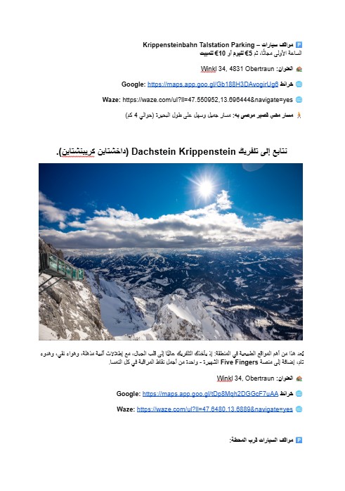نحن نرافقكم ليس فقط في مرحلة التخطيط – بل طوال الرحلة أيضاً. بعد استلامكم للمسار، يمكنكم طرح أي سؤال، وطلب تعديلات أو تغييرات، وسنقوم بتحديث المسار وفقاً لاحتياجاتكم. وحتى أثناء وجودكم في النمسا – نحن متاحون عبر الهاتف أو الواتساب أو البريد الإلكتروني للإجابة عن أي استفسار، وتقديم النصائح، أو المساعدة الفورية في الوقت الحقيقي.