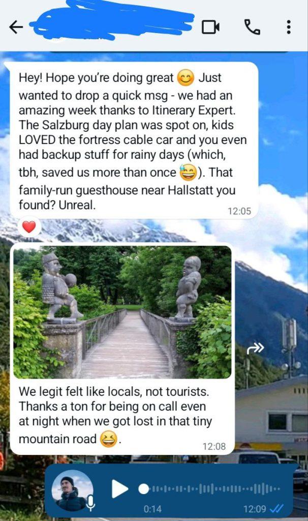 We’re by your side even during the trip. We stay with you throughout your vacation – providing professional help whenever needed. If the weather changes, there’s a strike, a local event, heavy crowds, or any unexpected situation – we are here to update, guide, and adjust your itinerary in real time.