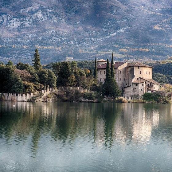 Castel Toblino has its origins in 201 AD, when it was initially established as a pagan temple dedicated to fairies. The “Epigrafe dei Tublinati,” an archaeological artifact from the 3rd century AD embedded in the castle’s portico, provides evidence of this early history. Over the centuries, the castle transformed and developed into a fortified structure under the influence of the Cles and Madruzzo families in the 16th century. Today, it stands as a testament to its storied past, with visible elements from its medieval and Renaissance transformations.