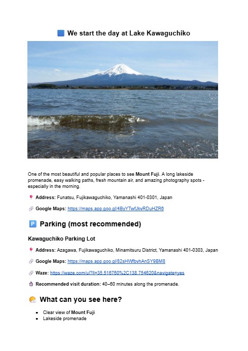 Easy-to-use itinerary – with direct navigation links. Your itinerary includes direct Waze / Google Maps links – no need to search for parking addresses, no stress, no mistakes. Just tap – and go.