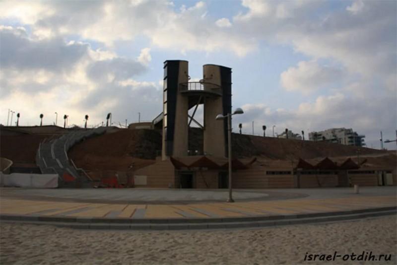 Кроме этого, очень важной особенностью этого пляжа является доступность для инвалидов – прямо возле пляжа есть огромная стоянка для инвалидов, с горки к пляжу можно спуститься на лифте, а за песчаной полосой есть очень широкая полоса дорожки.
