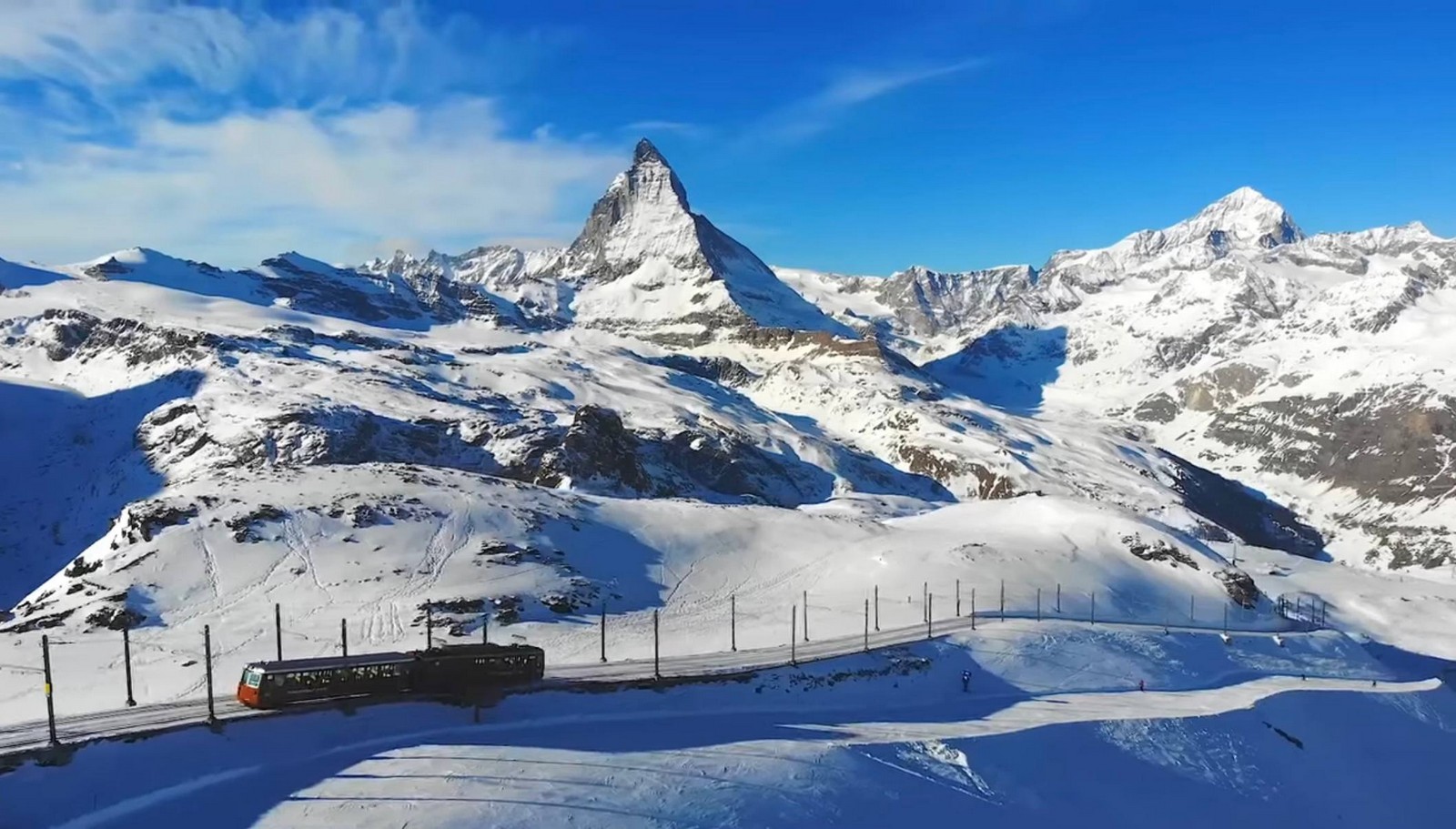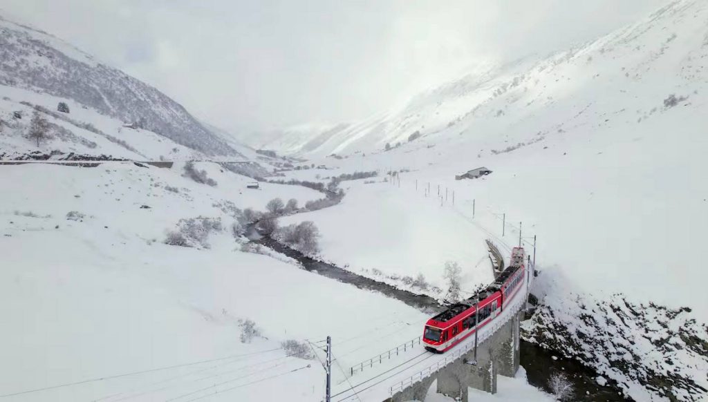 A scenic train ride between snowy peaks – Switzerland at its finest